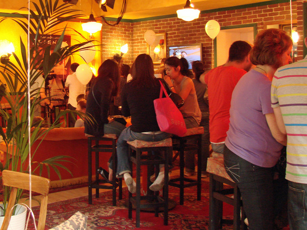 На пороге кафе стоял охранник, разрешил пофотографировать интерьер с порога. Внутри все выглядит очень похоже Слева стоит тот самый диванчик.